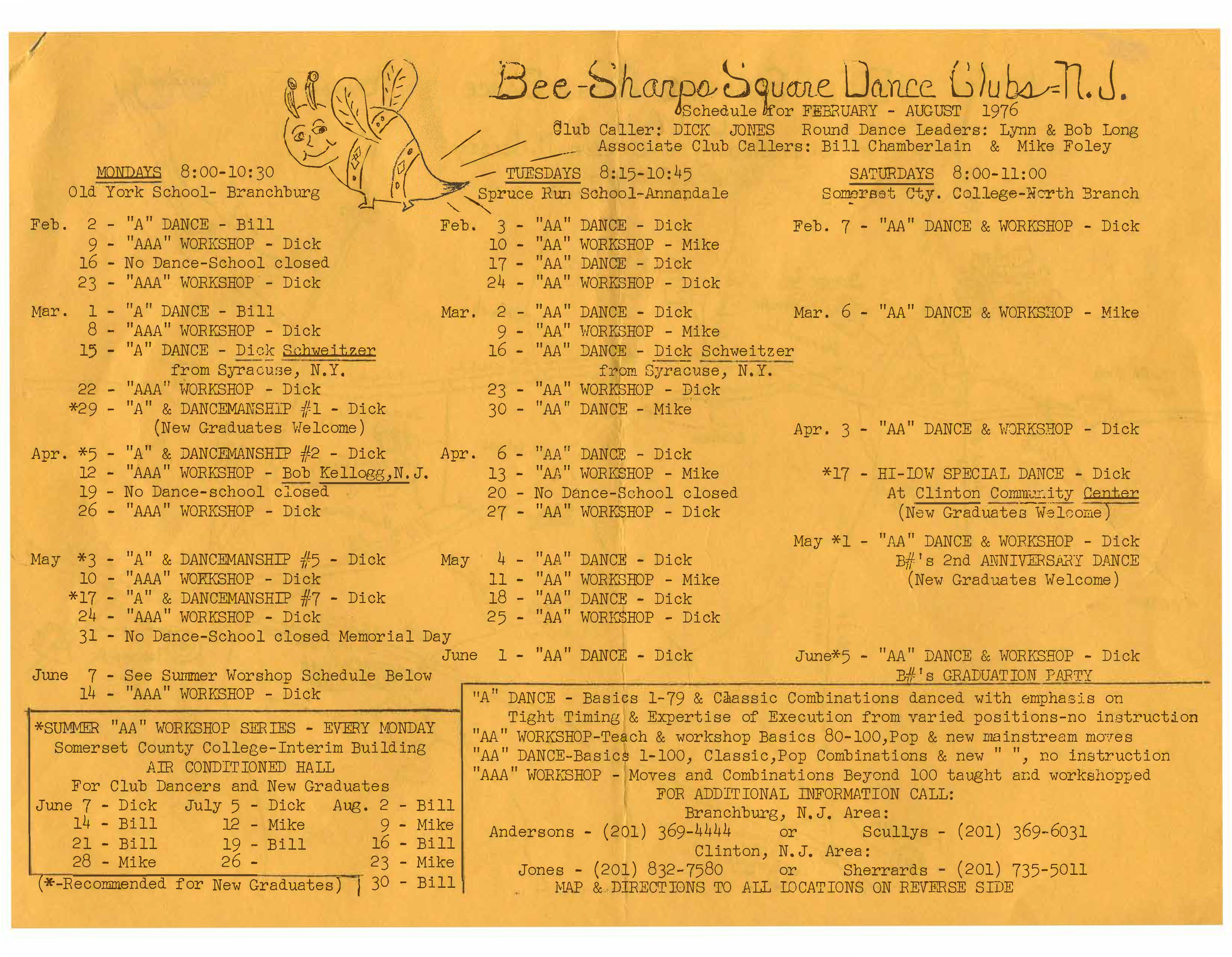 Below is a flyer from the Bee Sharps Square Dance club in New Jersey. It is dated for the Spring of 1976. The club caller was Dick Jones. I've put it here to illustrate how Square Dance Clubs advertised their dances before the standardization of the lists/programs. This club dances the Mainstream and Plus Program. This club is currently part of the Northern New Jersey Square Dancers Association (NNJSDA).